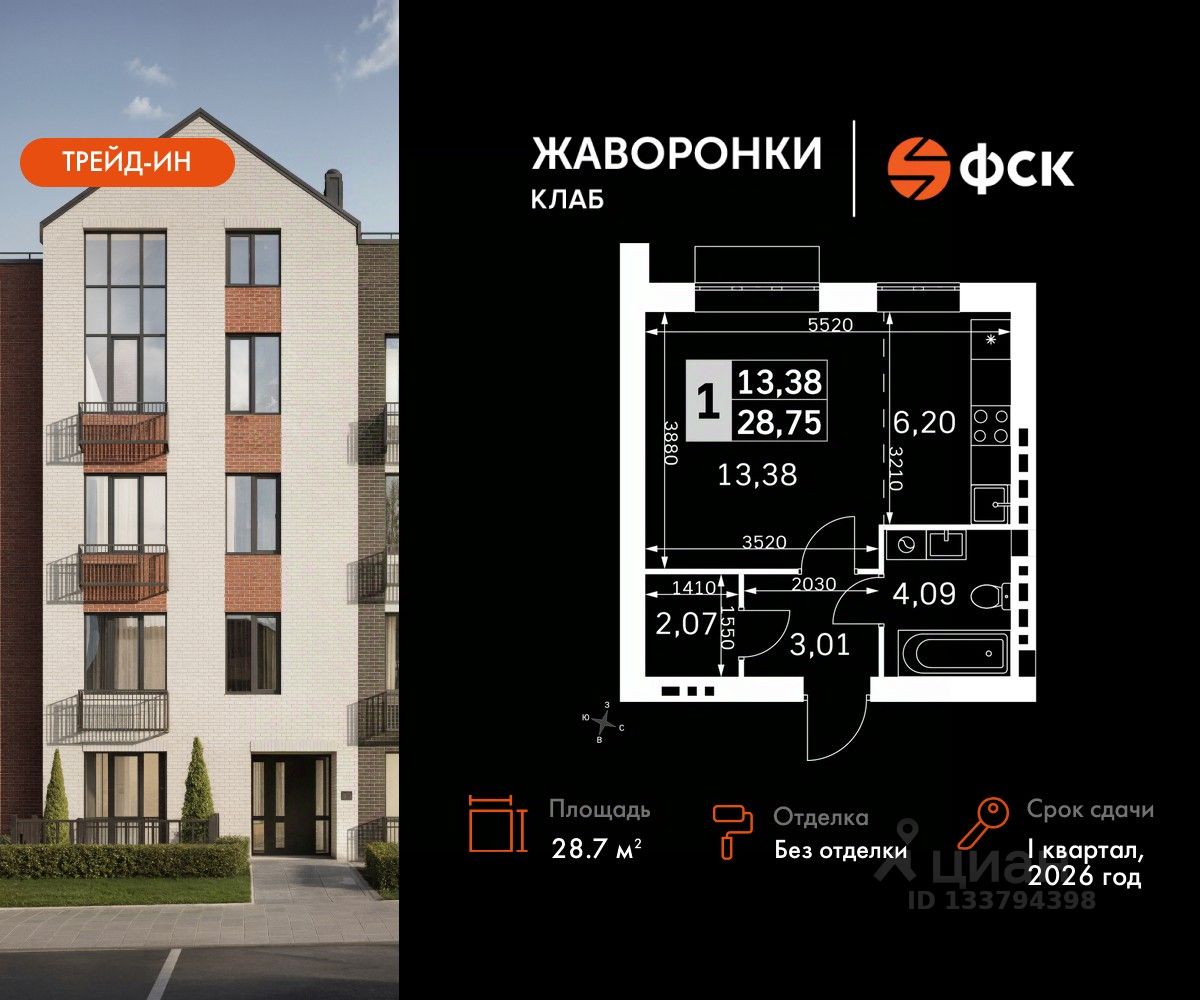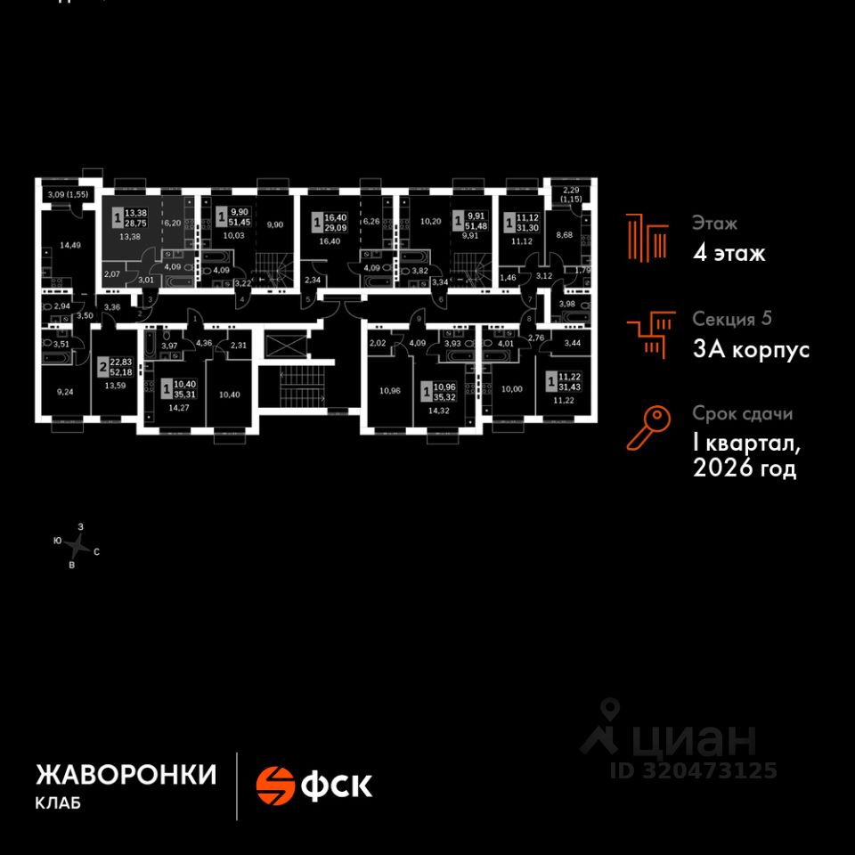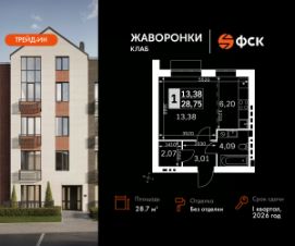 Продаётся студия номер 104 общей площадью 28.75 кв.м на 4-м этаже 4 этажного дома. Без отделки.