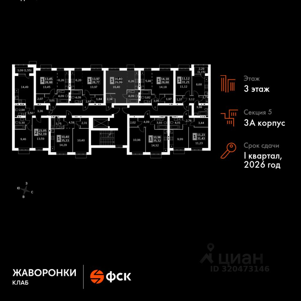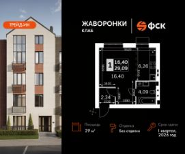 Продаётся студия номер 97 общей площадью 29.09 кв.м на 3-м этаже 4 этажного дома. Без отделки.