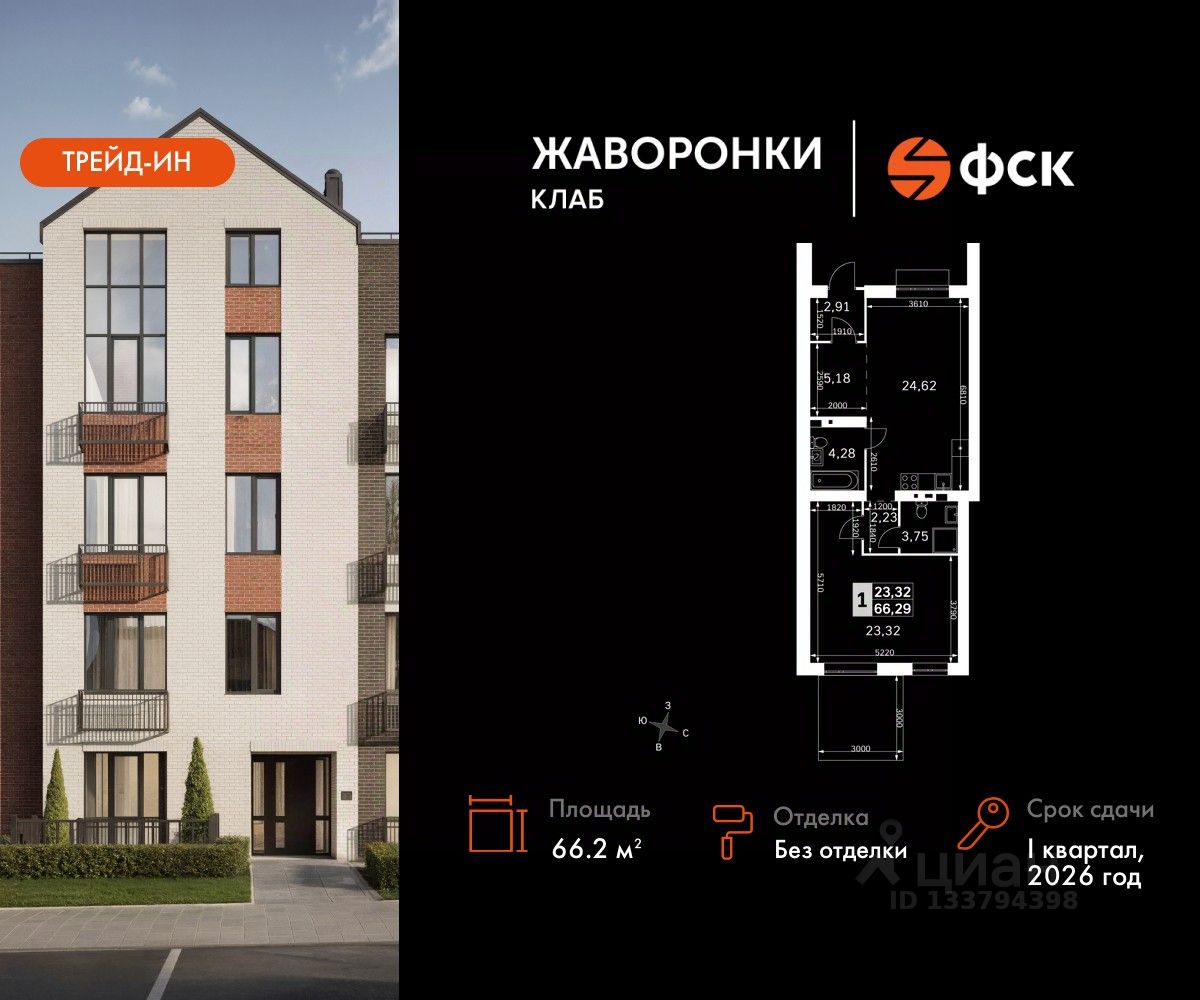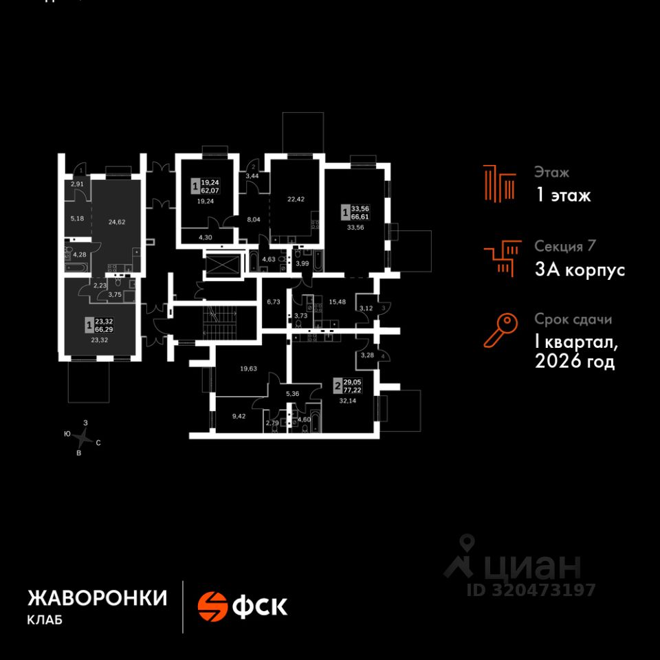 Продаётся 2-к квартира номер 143 общей площадью 66.29 кв.м на 1-м этаже 4 этажного дома. Без отделки.