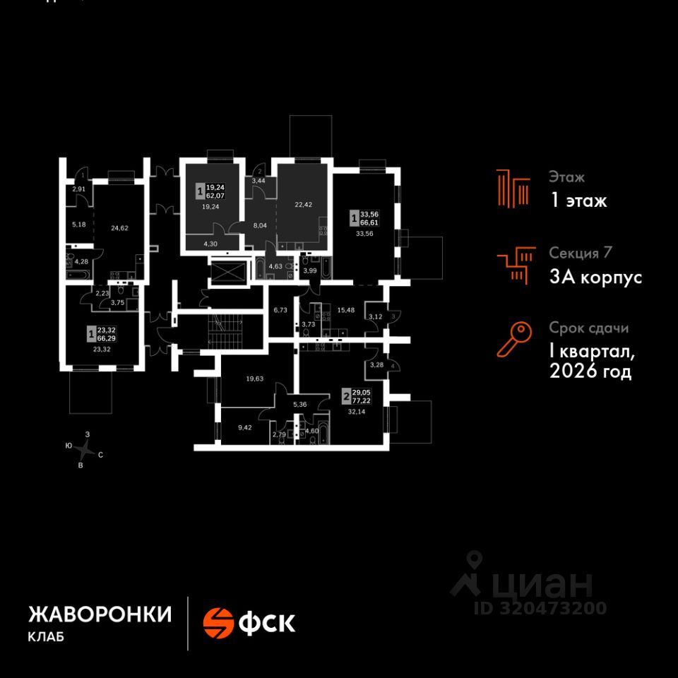 Продаётся 2-к квартира номер 144 общей площадью 62.07 кв.м на 1-м этаже 4 этажного дома. Без отделки.