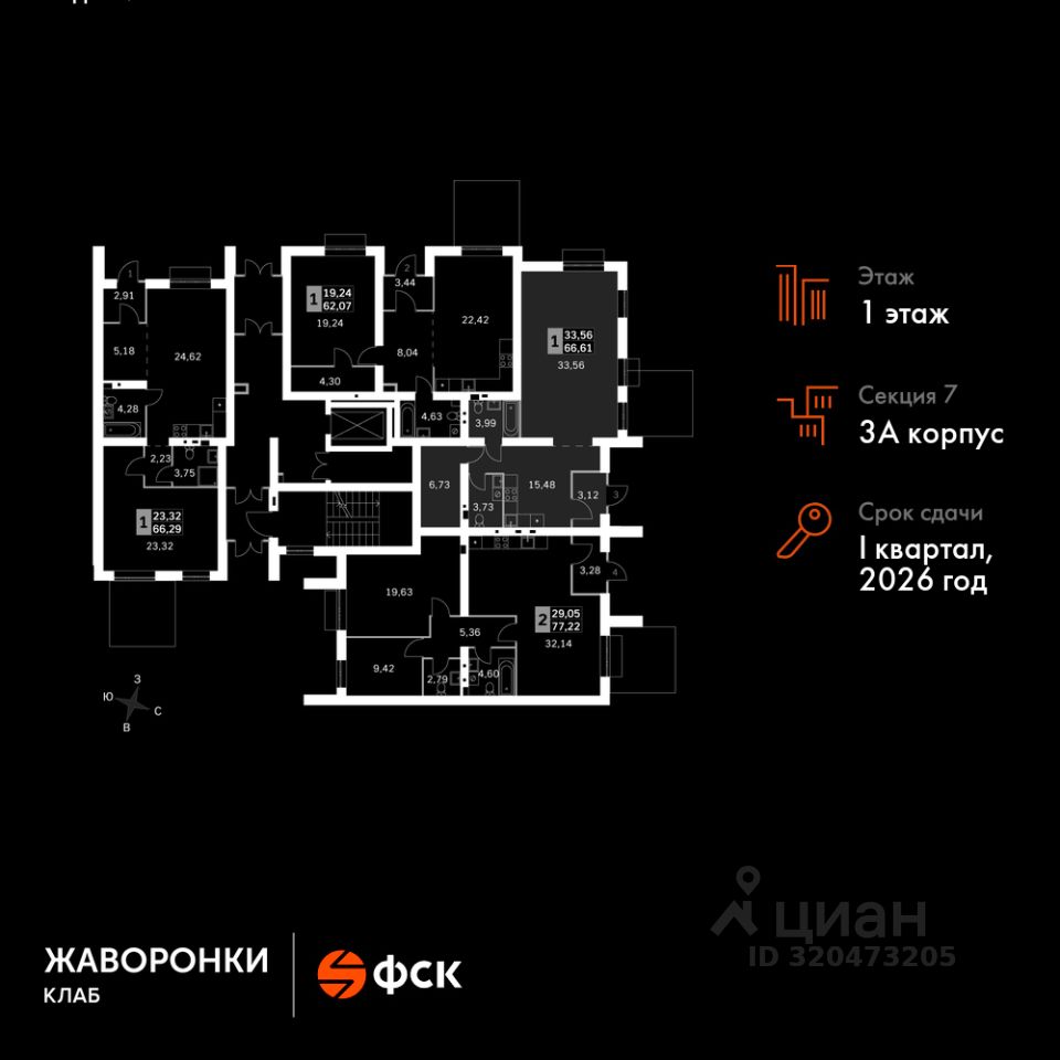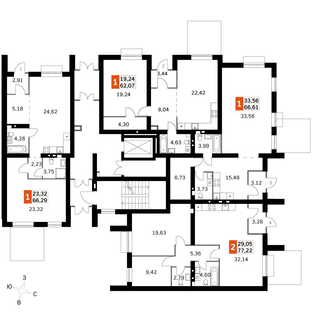 Продаётся 2-к квартира номер 145 общей площадью 66.61 кв.м на 1-м этаже 4 этажного дома. Без отделки.