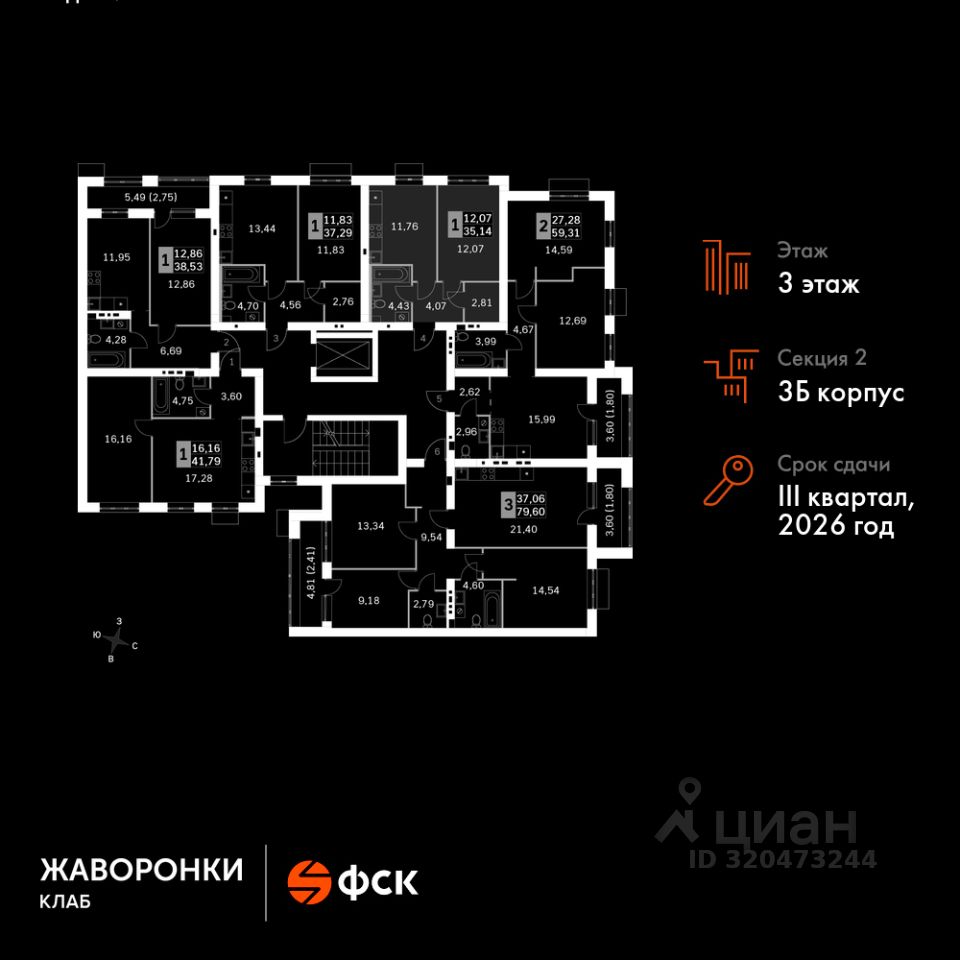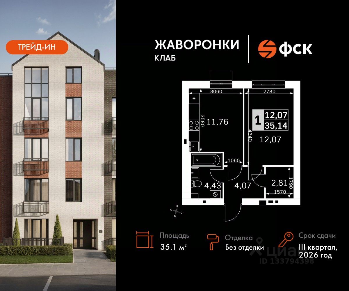 Продаётся 1-к квартира номер 28 общей площадью 35.14 кв.м на 3-м этаже 4 этажного дома. Без отделки.