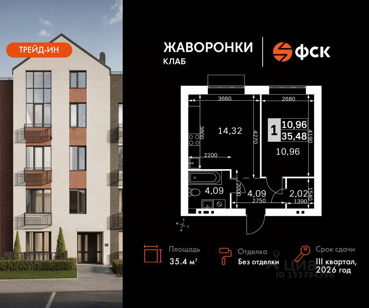 Продаётся 1-к квартира номер 104 общей площадью 35.48 кв.м на 4-м этаже 4 этажного дома. Без отделки.