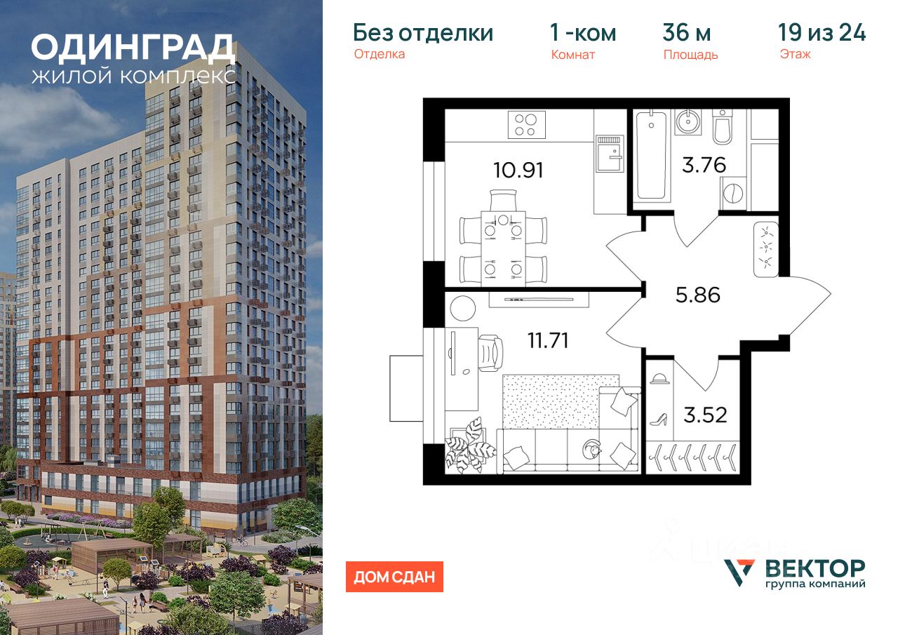 Прямая продажа от застройщика. Продается 1-комн. квартира площадью 36 кв.м на 19 этаже 24 этажного дома в ЖК "Одинград" от федерального девелопера ГК "Вектор".