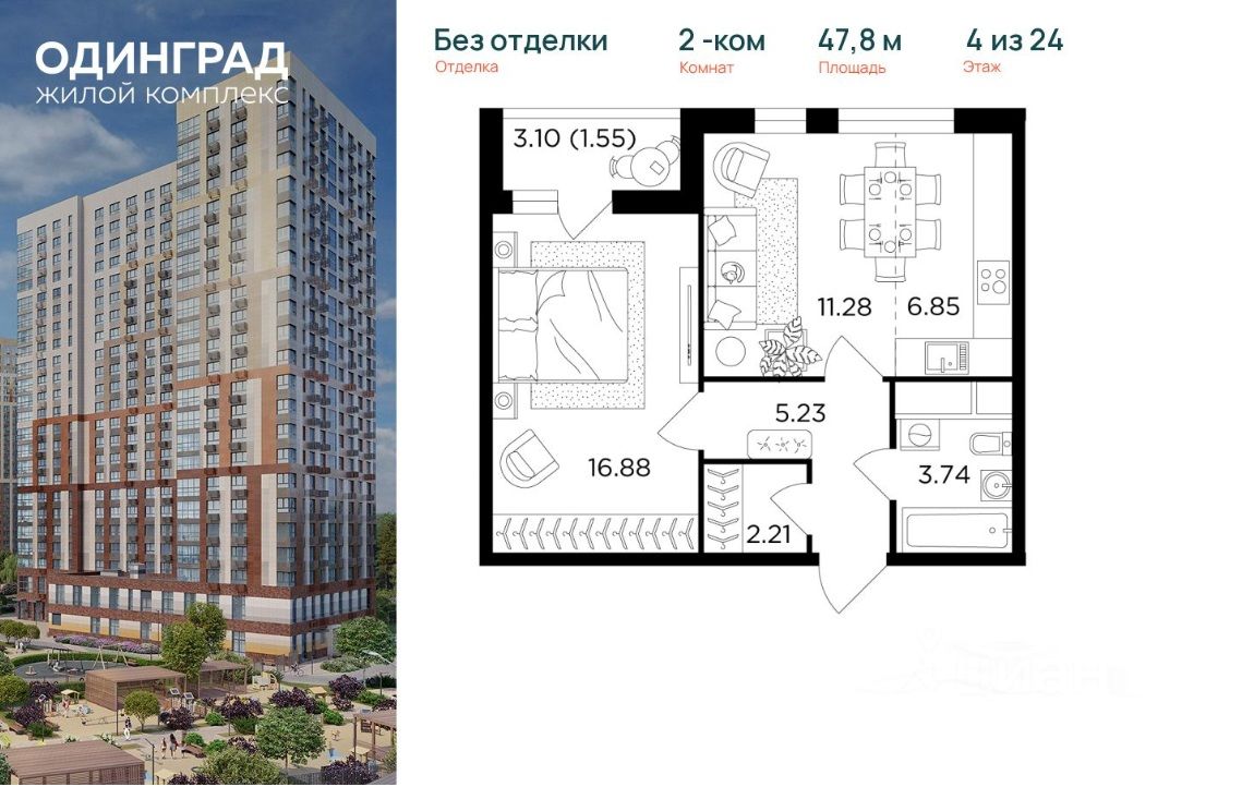 Продается 2-комн. квартира площадью 47,74 кв.м на 4 этаже 24 этажного дома в ЖК Одинград. Расположение: Запад Одинцова — район с чистым воздухом, лесопарками, спортивной инфраструктурой и удобным выездом в Москву. Транспортная доступность. Собственный выезд на М-1. 10 минут до Москвы, 20 — до Москва-Сити. Общественным транспортом: 30 минут до метро, 40 — до Киевского вокзала. Инфраструктура: На территории — два детских сада, своя школа, магазины, супермаркеты, аптека, стоматология, салоны красоты, кафе, студия йоги, барбершоп, химчистка. В шаговой доступности — престижные школы (СОШ 9, СОШ 12, Одинцовская гимназия 13), лицеи, гимназии, включая филиал МГИМО, Ледовый дворец Армада, шахматная школа, Один взрослый собственник. Никто не прописан
