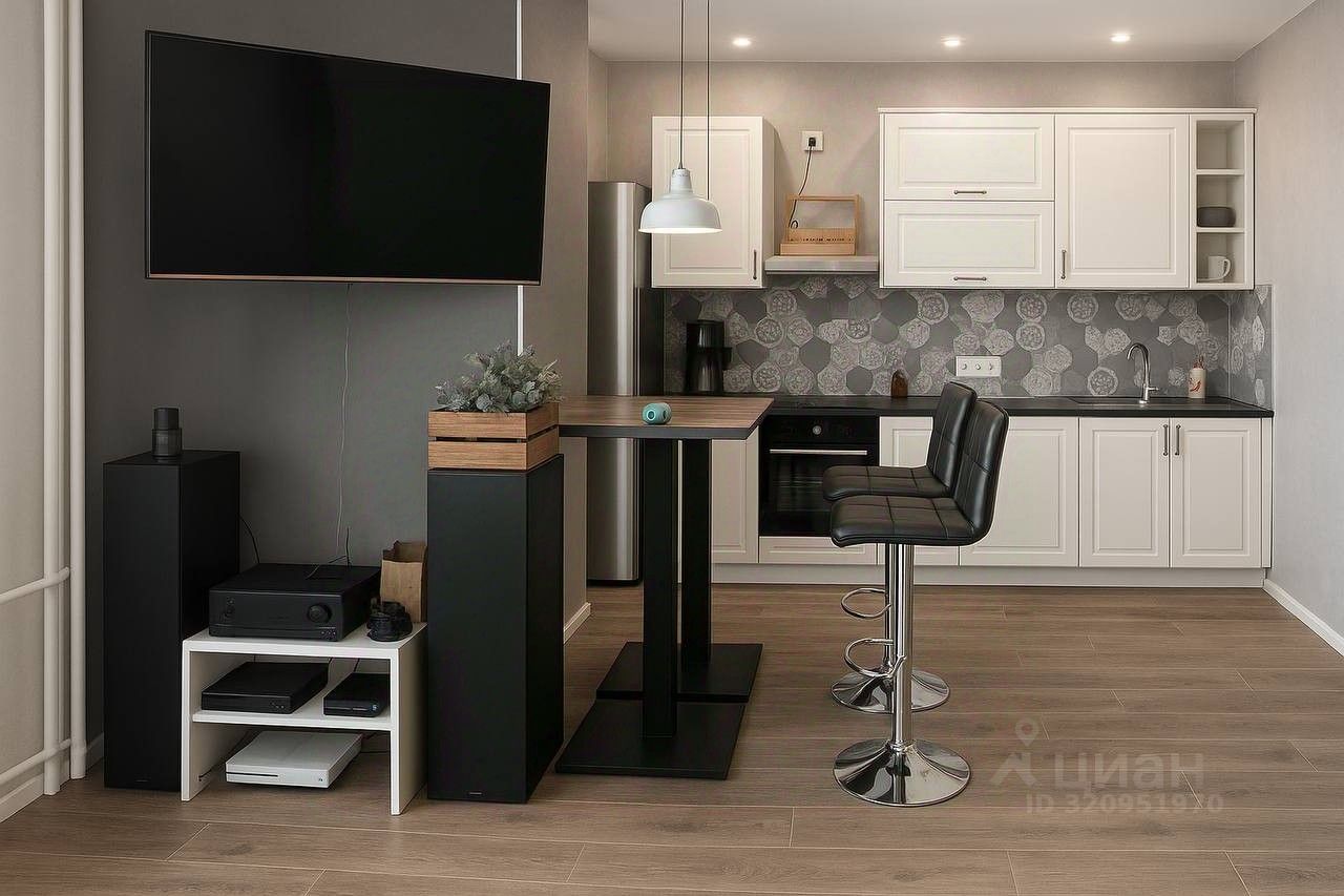 Перепланировка: кухня объединена с гостиной, создавая просторную зону. Кухонный гарнитур IKEA, барная стойка со стульями, посудомоечная машина BOSCH, индукционная плита и духовой шкаф Gorenje европейского производства. Многоуровневое освещение с проходными выключателями и дистанционным управлением.