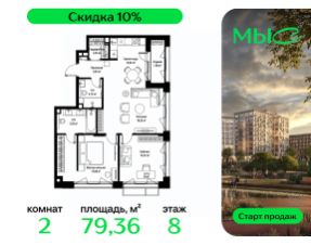 Продаётся 2-к квартира общей площадью 79.36 м² без отделки в премиальном жилом комплексе "МЫС" на 8-м этаже 12 этажного дома. Квартира расположена в корпусе "Сибирь".