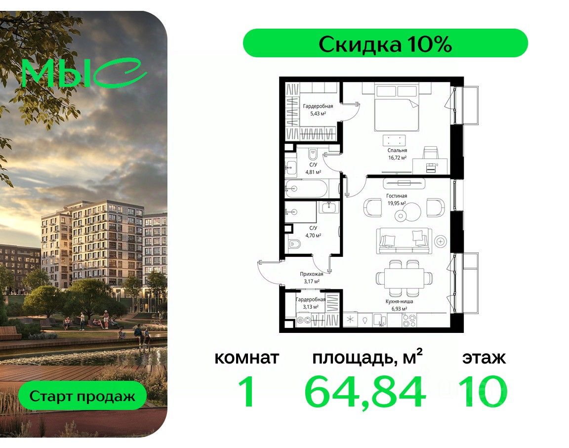 Продаётся 1-комнатная квартира общей площадью 64.84 м² без отделки в премиальном жилом комплексе "МЫС" на 10-м этаже 12 этажного дома. Квартира расположена в корпусе "Сибирь".