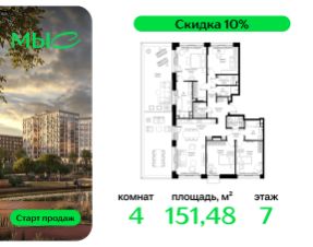 Продаётся 4-комнатная квартира общей площадью 151.48 м² без отделки в премиальном жилом комплексе "МЫС" на 7-м этаже 12 этажного дома. Квартира расположена в корпусе "Волга".