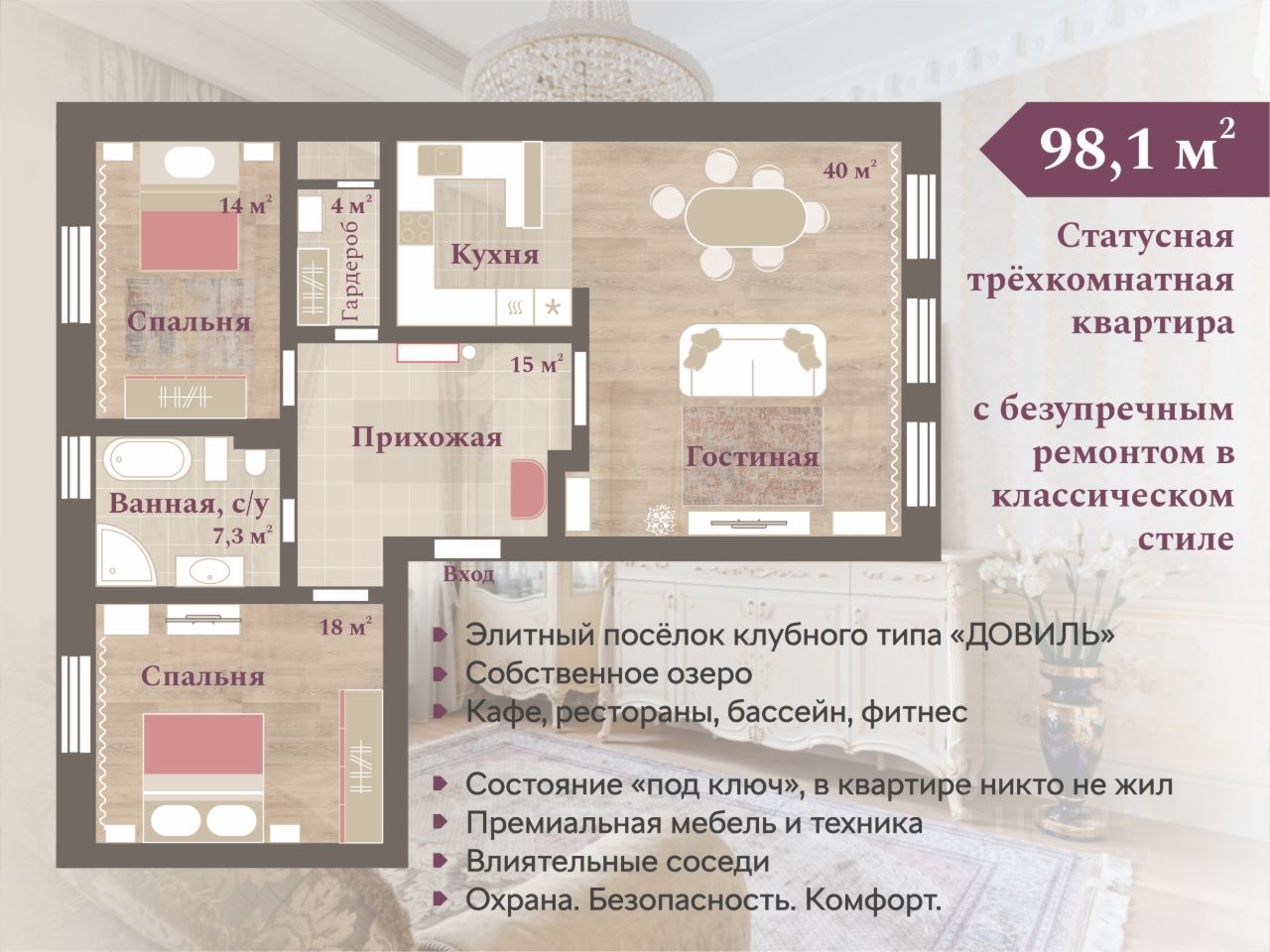В продаже трёхкомнатная квартира общей площадью 98,1 кв.м.