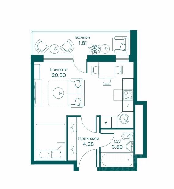 общая площадь 28 кв.м. + лоджия 3 кв.м.