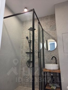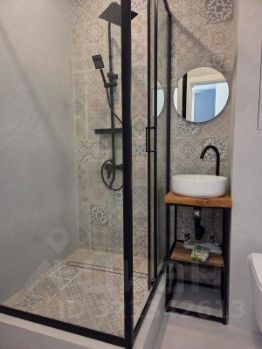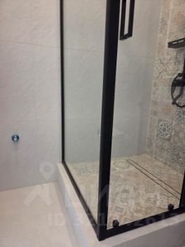 Современный совмещенный санузел: Просторная и функциональная душевая кабина,отделанная качественной плиткой.