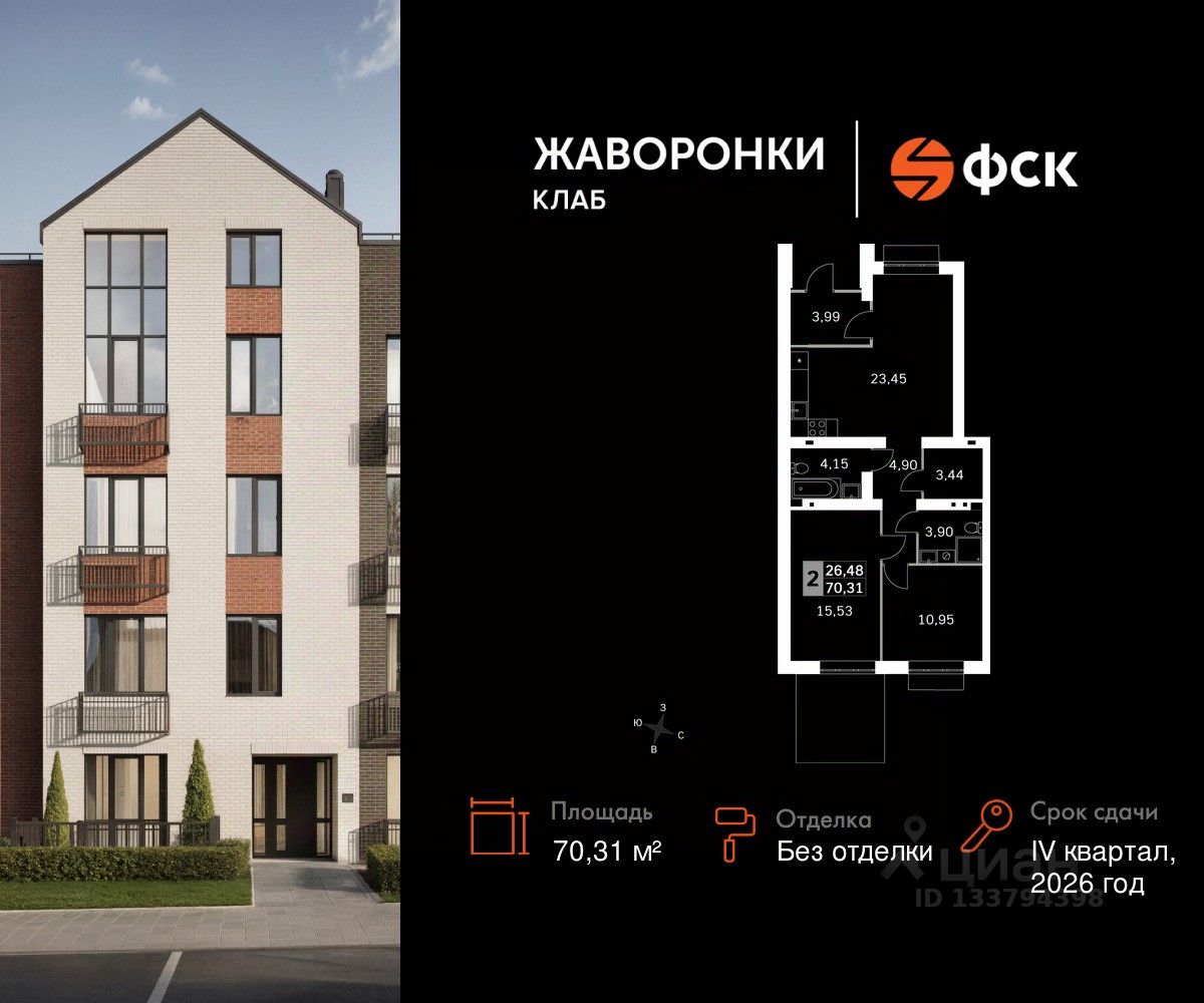 Продаётся 2-к квартира 112 общей площадью 70.31 кв.м на 1-м этаже 4 этажного дома. Без отделки.