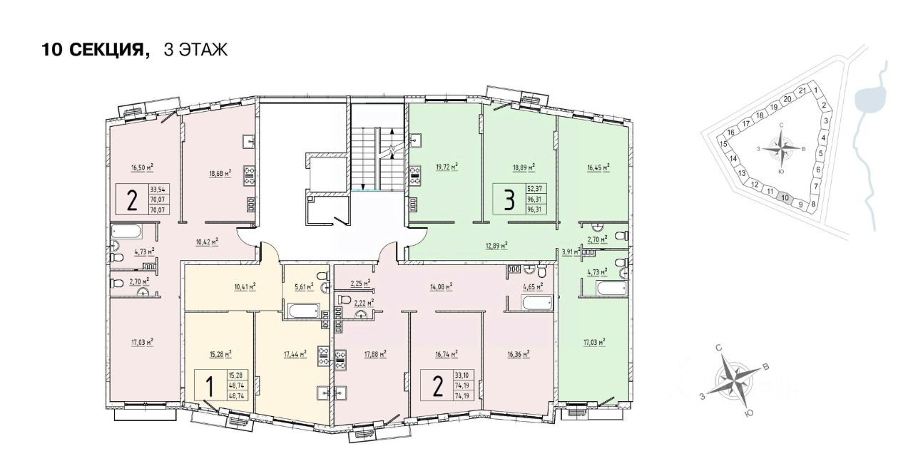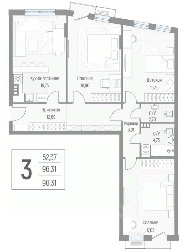 Прямая продажа от застройщика! Дом сдан, ключи в день покупки. Продаётся 3-комнатная квартира общей площадью 96,2 кв.м на 3-м этаже 4 этажного дома.