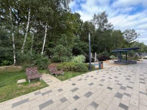 Красивый двор с ландшафтным дизайном,с прогулочными зонами и местами для отдыха. Есть магазины, пекарня др.
