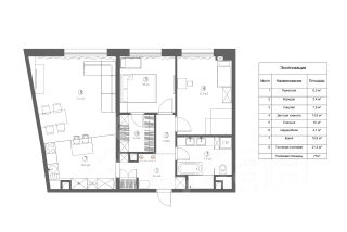 Две спальни, кухня-гостиная, 2 санузла, гардеробная.