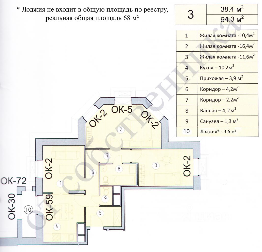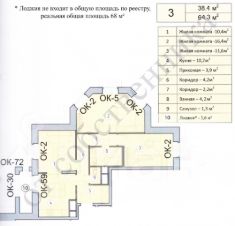Общая площадь: 68 кв.м (64,3 кв.м по реестру плюс лоджия 3,6 кв.м, не входящая в общую площадь)