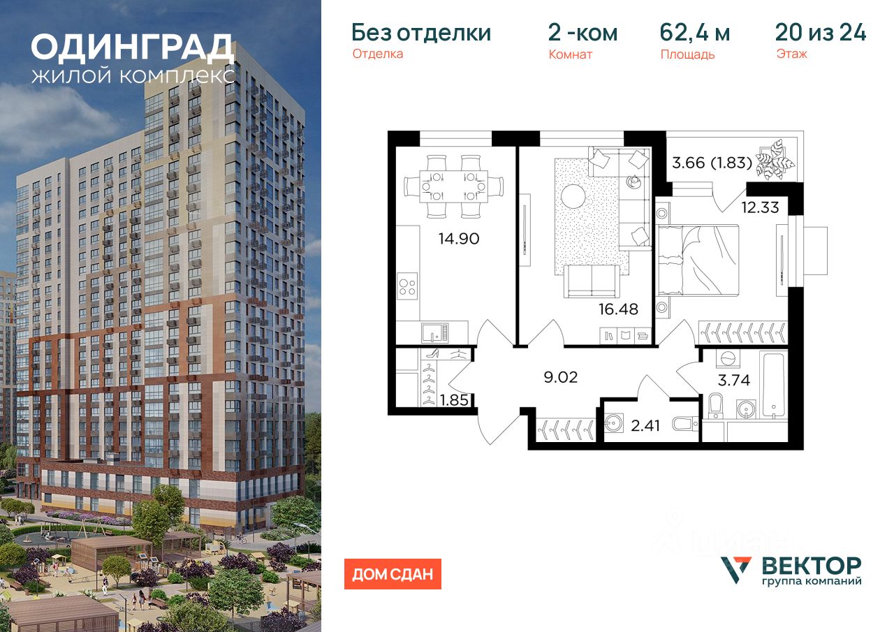 Прямая продажа от застройщика. Продается 2-комн. квартира площадью 62,4 кв.м на 20 этаже 24 этажного дома в ЖК "Одинград" от федерального девелопера ГК "Вектор".
