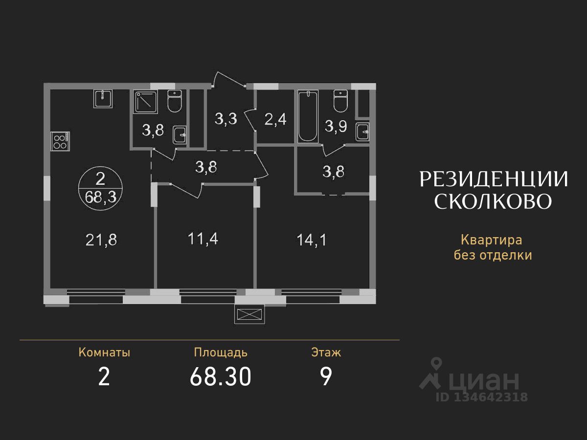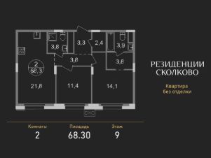 Общая площадь квартиры - 68,3 кв. м, этаж 9 из 9.