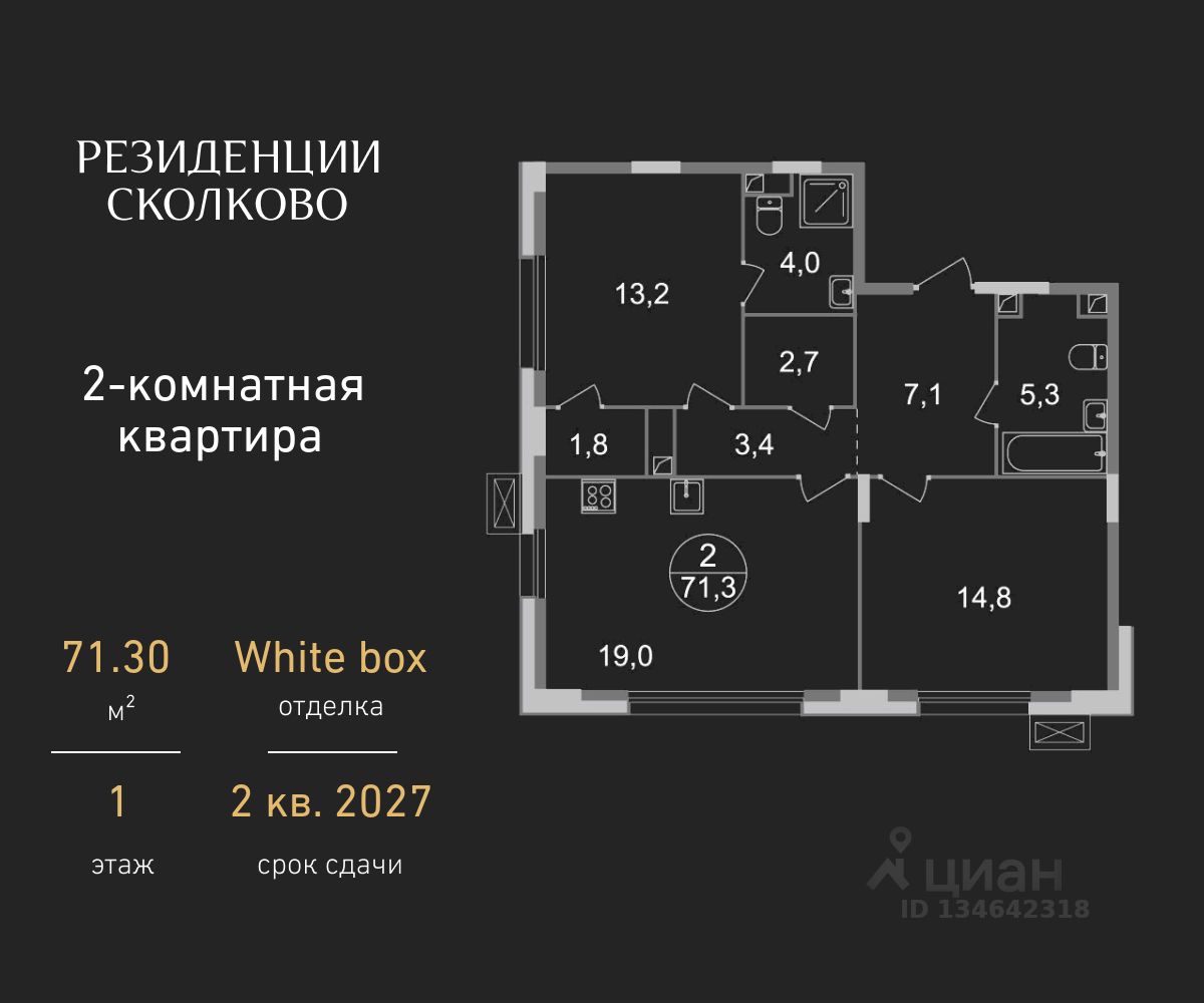 Общая площадь квартиры - 71,3 кв. м, этаж 1 из 9.