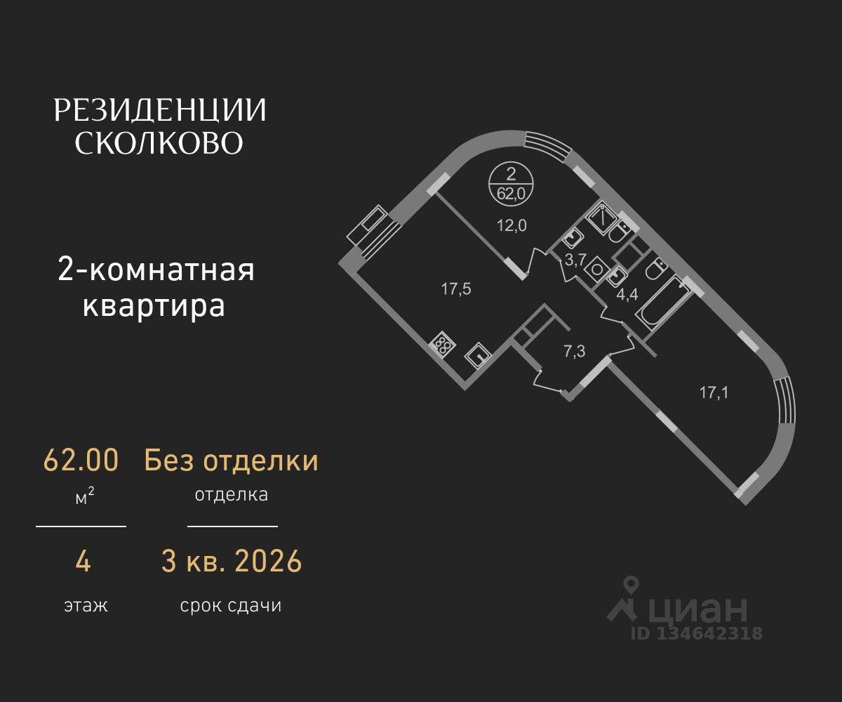 Общая площадь квартиры - 62 кв. м, этаж 4 из 9.