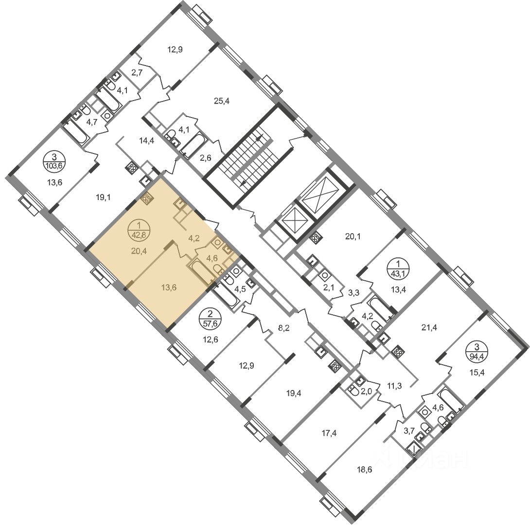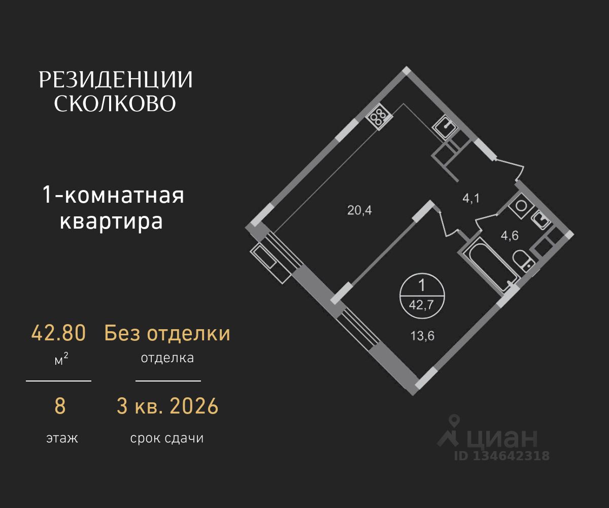 Общая площадь квартиры - 42,8 кв. м, этаж 8 из 9.