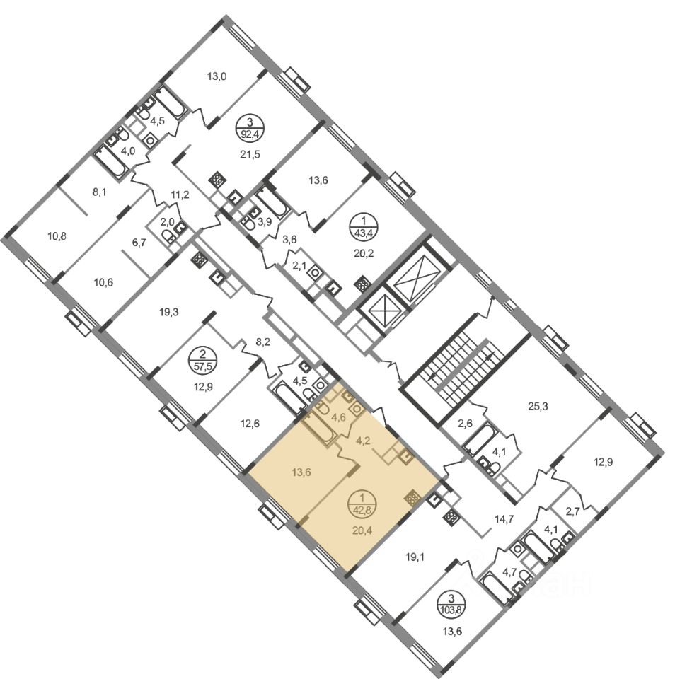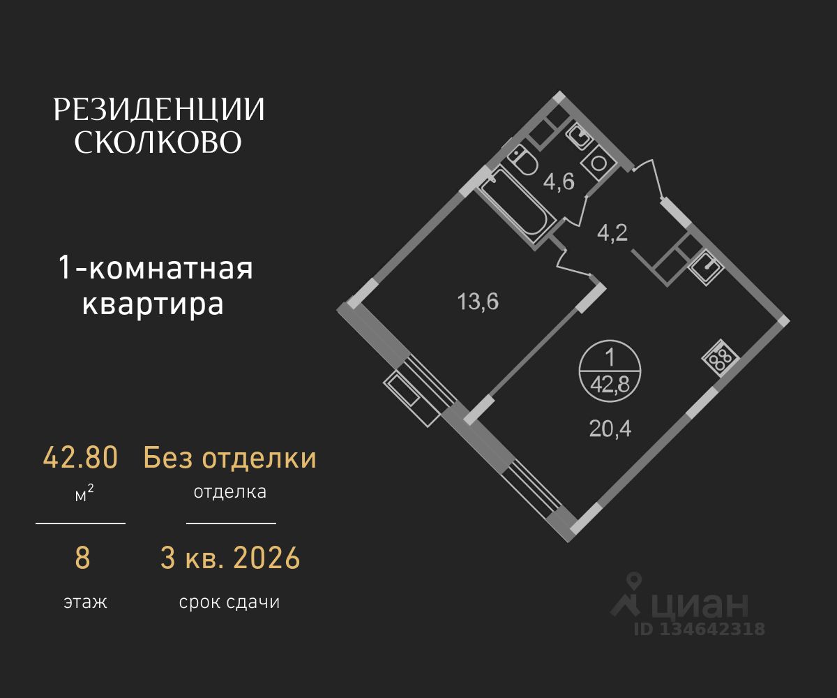 Общая площадь квартиры - 42,8 кв. м, этаж 8 из 9.