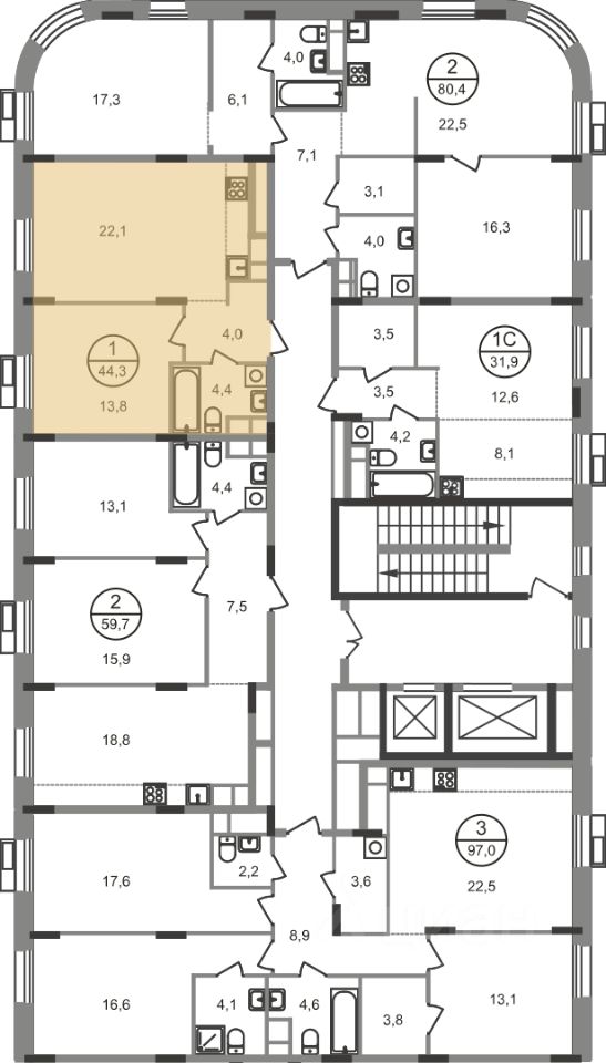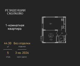 Общая площадь квартиры - 44,3 кв. м, этаж 5 из 9.