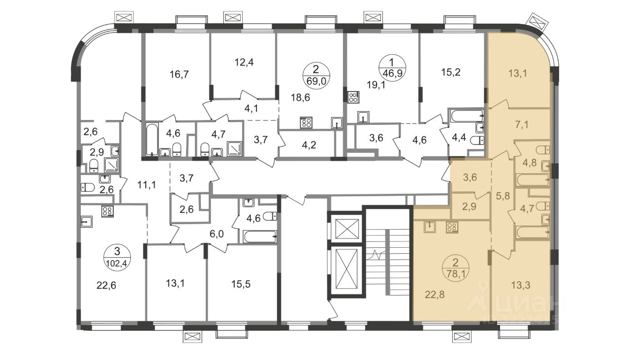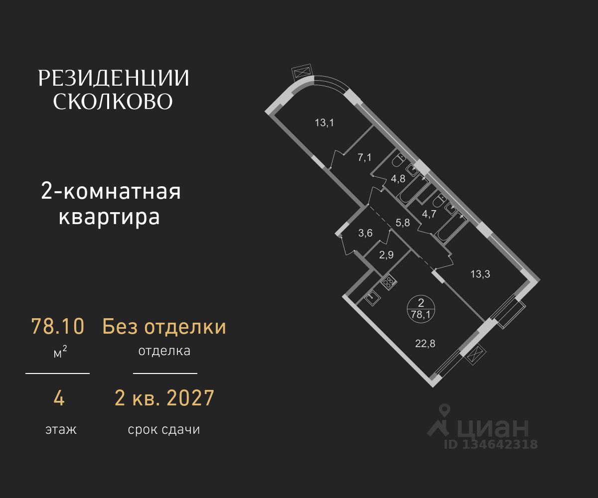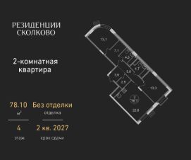 Общая площадь квартиры - 78,1 кв. м, этаж 4 из 9.