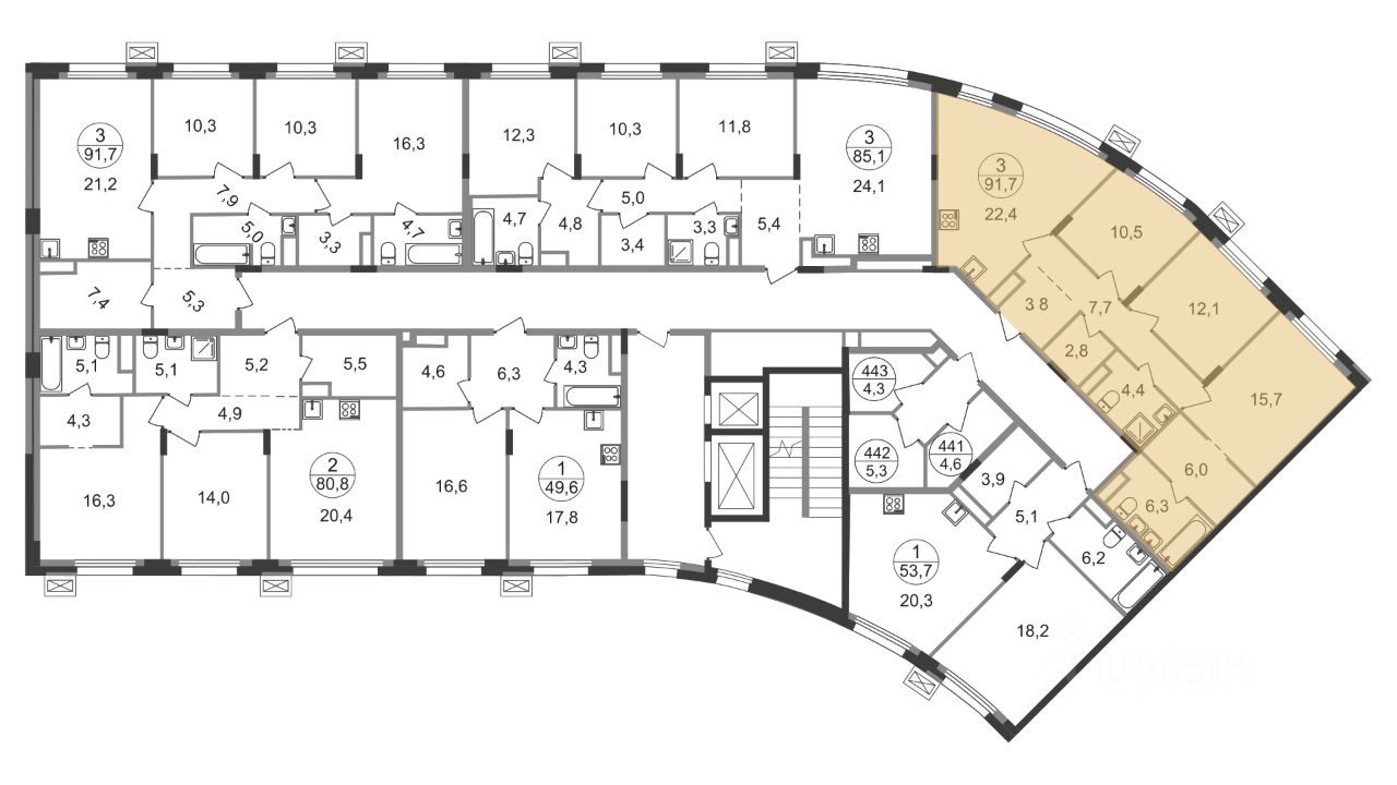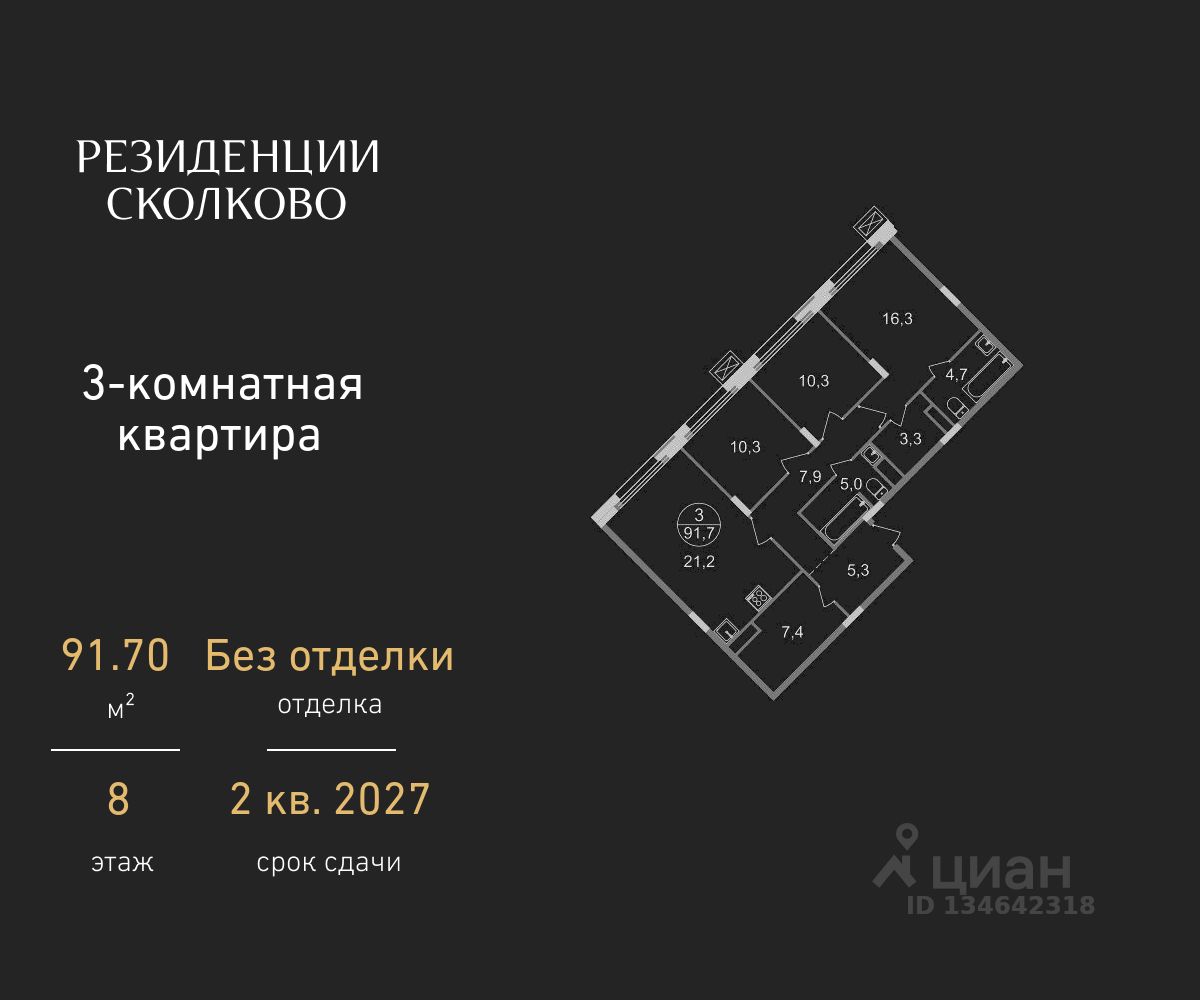 Общая площадь квартиры - 91,7 кв. м, этаж 8 из 9.