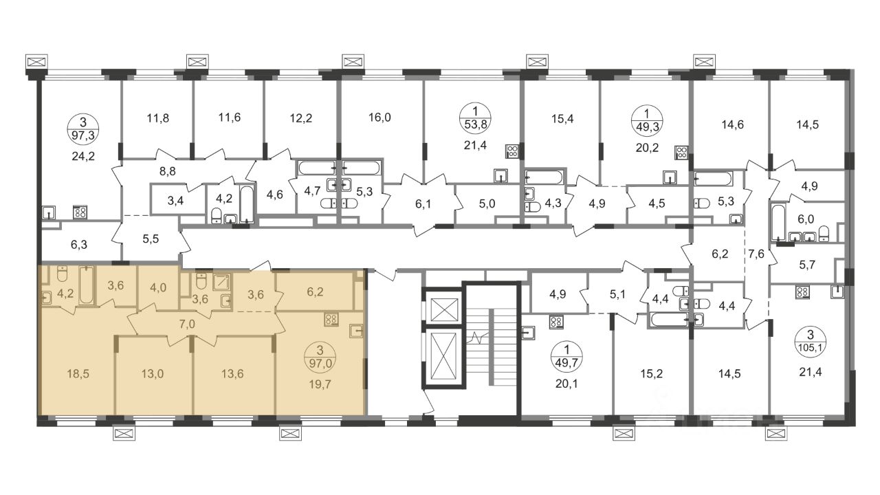 Общая площадь квартиры - 97 кв. м, этаж 7 из 9.