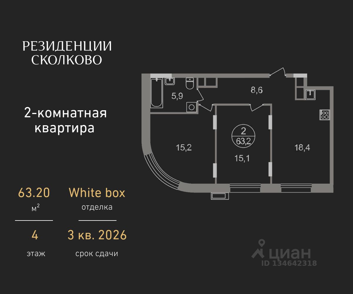 Общая площадь квартиры - 63,2 кв. м, этаж 4 из 9.