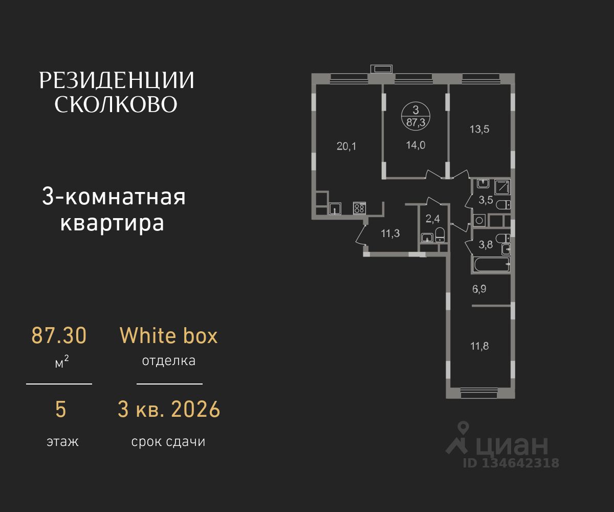 Общая площадь квартиры - 87,3 кв. м, этаж 5 из 9.
