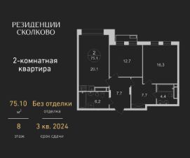 Общая площадь квартиры - 75,1 кв. м, этаж 8 из 9.