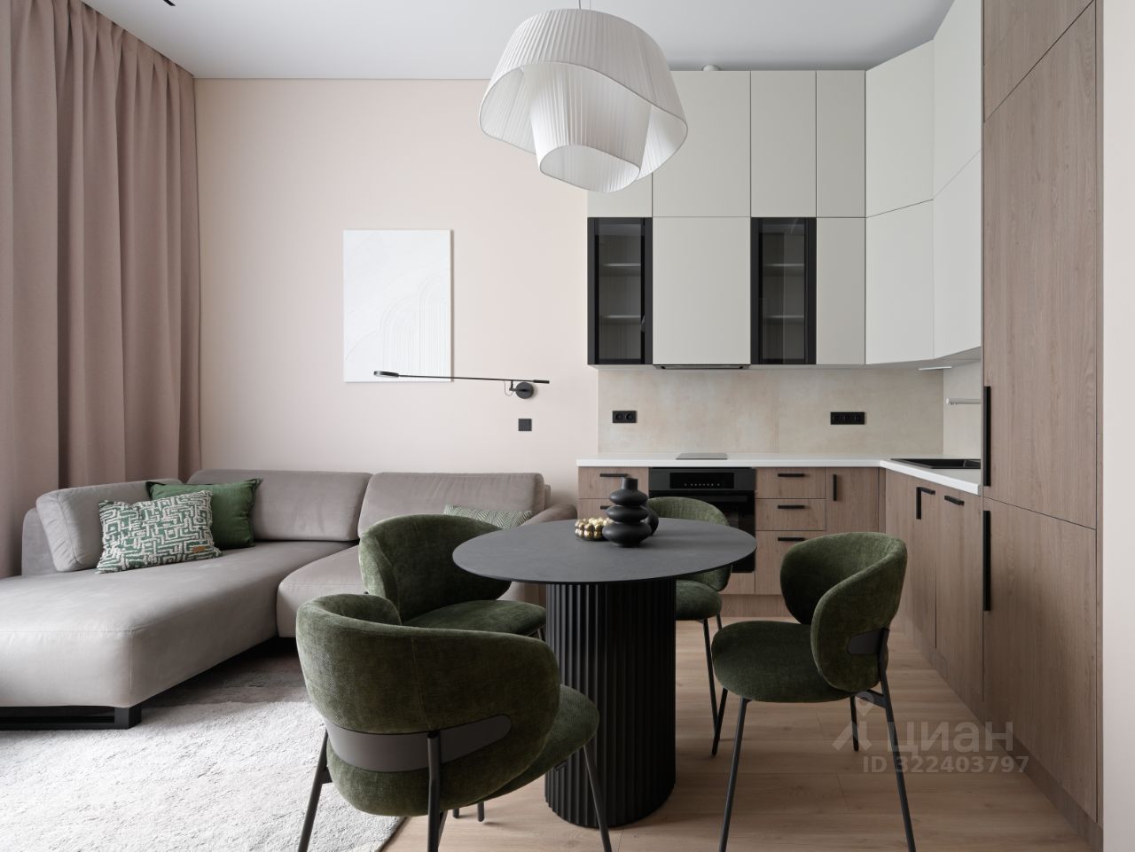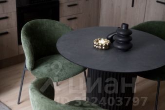 Кухня-гостиная с современной встроенной техникой, включая холодильник, посудомоечную машину, духовой шкаф, варочную панель, микроволновую печь и вытяжку. Здесь также есть уютная и стильная обеденная зона для комфортного отдыха и общения.
