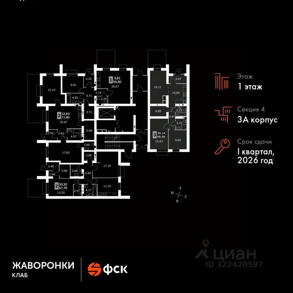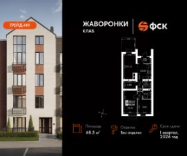 Продаётся 3-к квартира номер 57 общей площадью 68.56 кв.м на 1-м этаже 4 этажного дома. Без отделки.