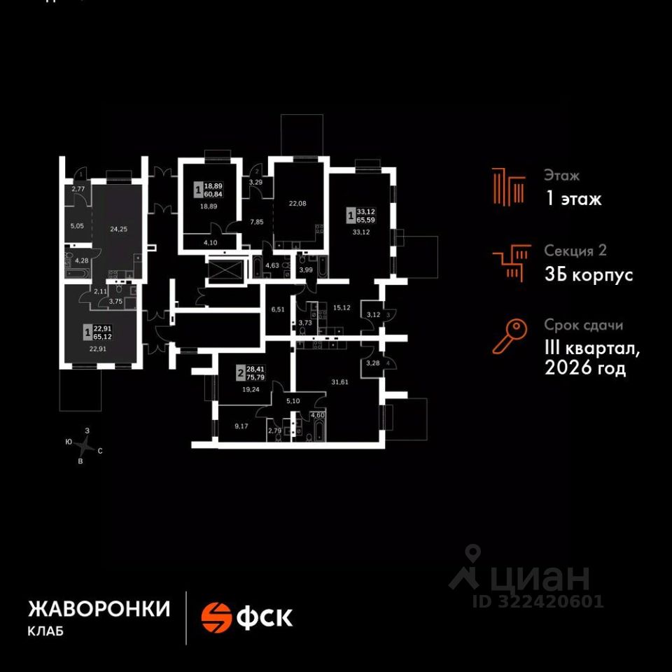Продаётся 2-к квартира номер 15 общей площадью 65.12 кв.м на 1-м этаже 4 этажного дома. Без отделки.