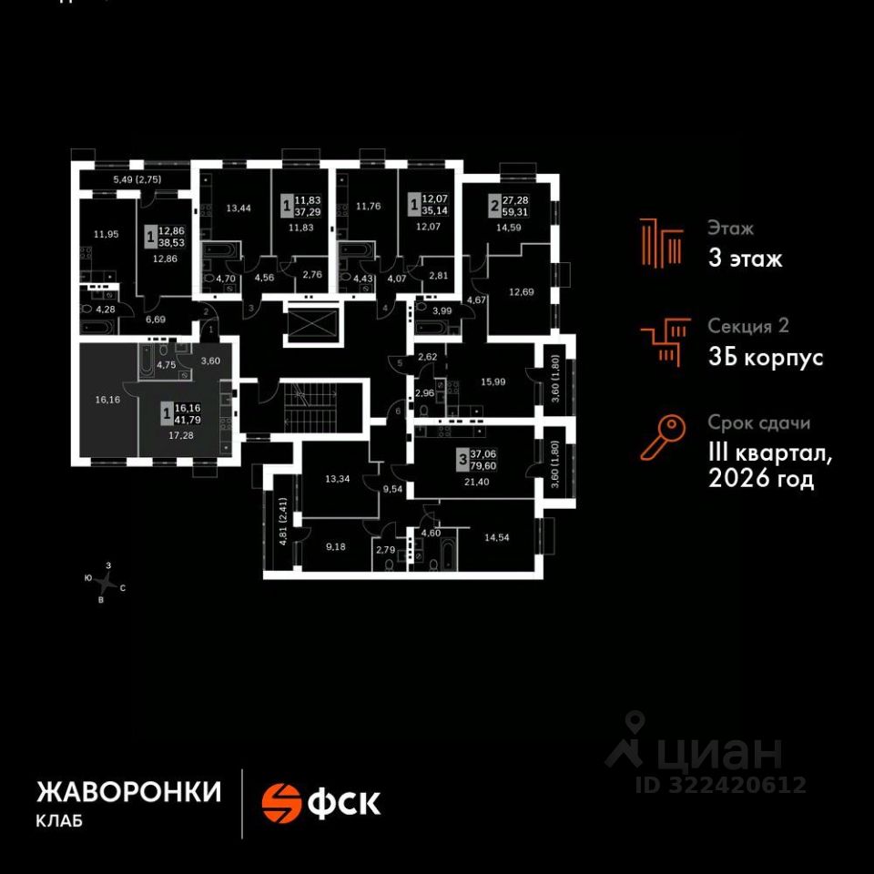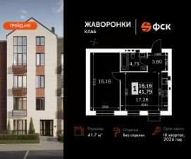Продаётся 1-к квартира номер 25 общей площадью 41.79 кв.м на 3-м этаже 4 этажного дома. Без отделки.