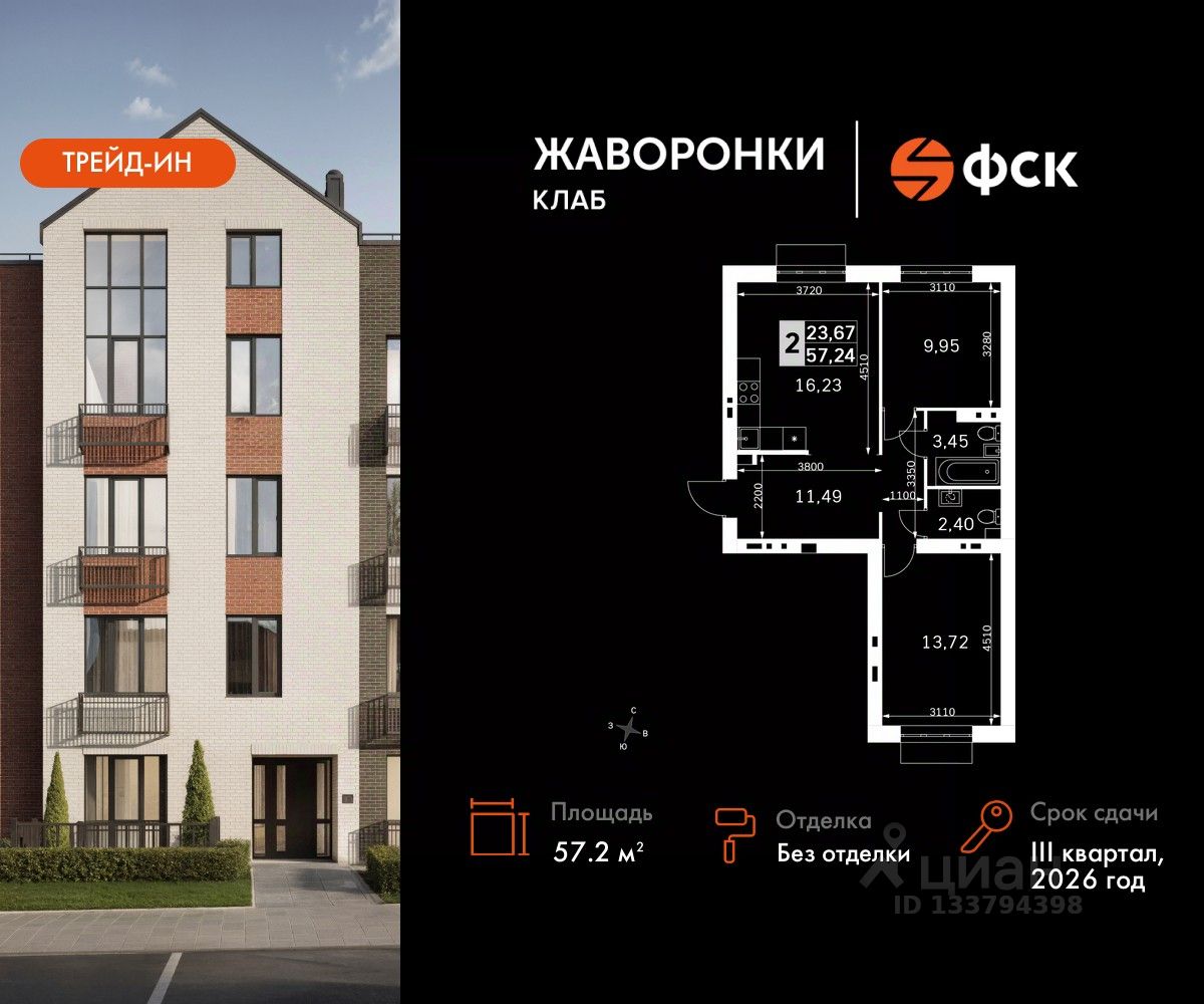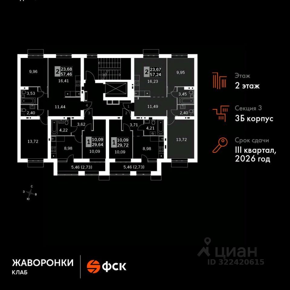 Продаётся 2-к квартира номер 39 общей площадью 57.24 кв.м на 2-м этаже 4 этажного дома. Без отделки.