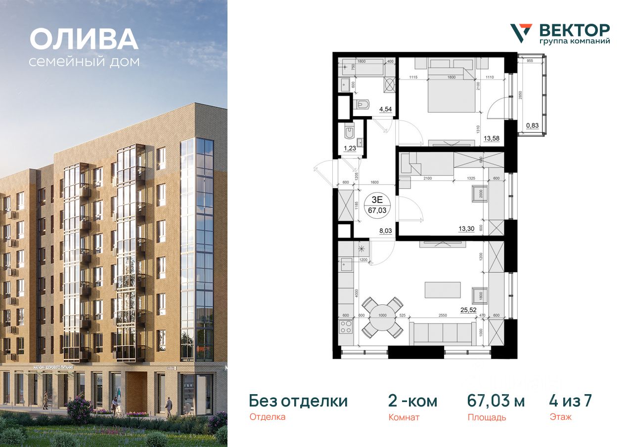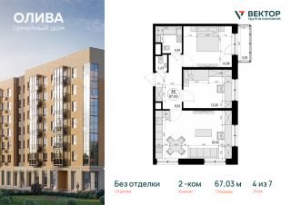 Продается 2-комн. квартира площадью 67,03 кв.м на 4 этаже 7 этажного дома в ЖК "Семейный дом Олива" от федерального девелопера ГК "Вектор".