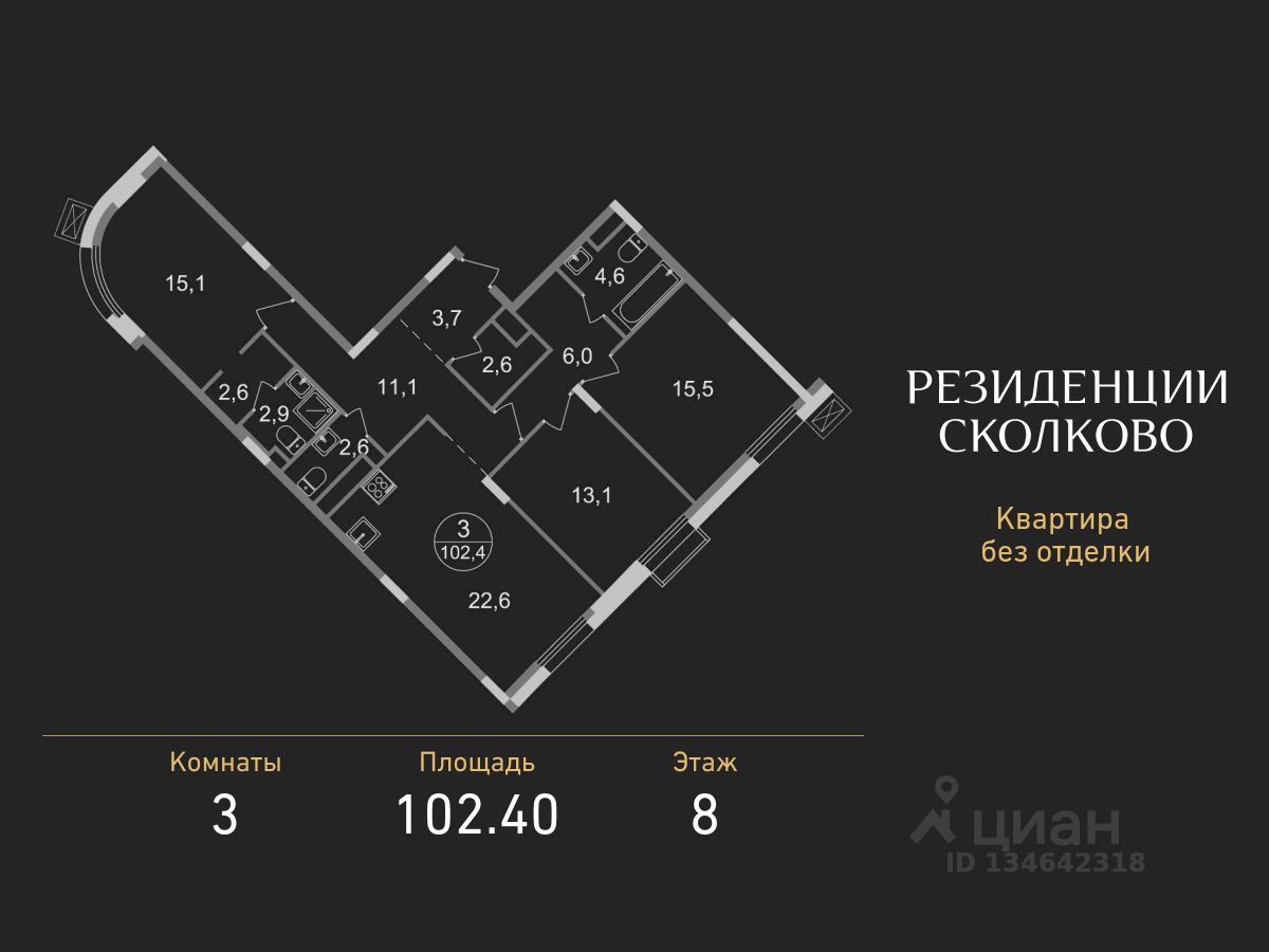 Общая площадь квартиры - 102,4 кв. м, этаж 8 из 9.