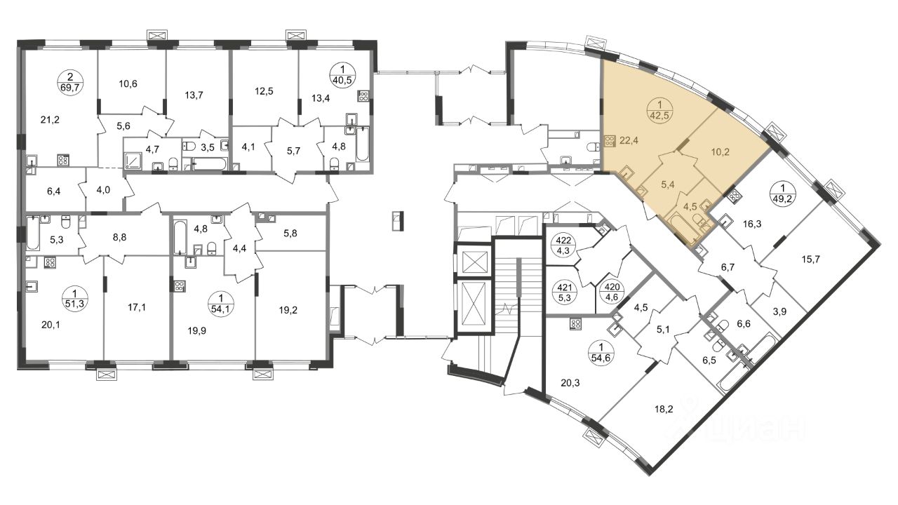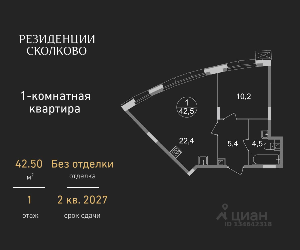 Общая площадь квартиры - 42,5 кв. м, этаж 1 из 9.