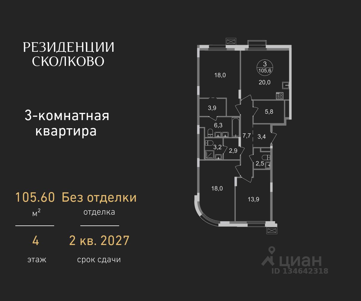 Общая площадь квартиры - 105,6 кв. м, этаж 4 из 9.