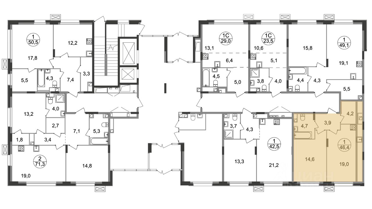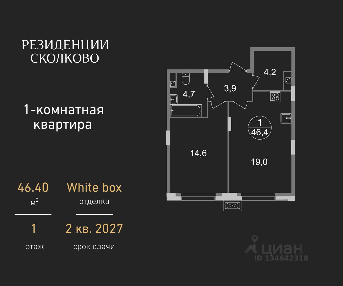 Общая площадь квартиры - 46,4 кв. м, этаж 1 из 9.