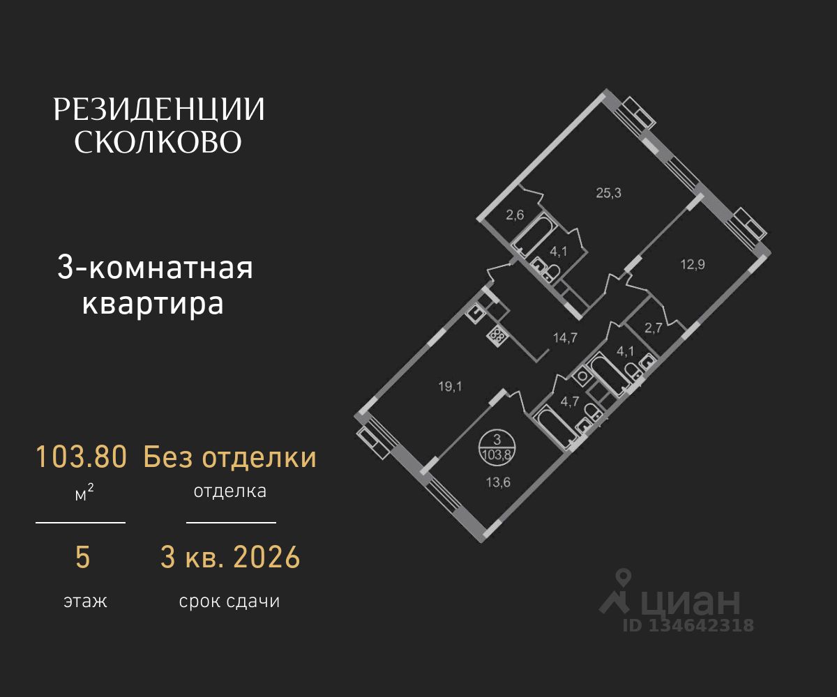 Общая площадь квартиры - 103,8 кв. м, этаж 5 из 9.