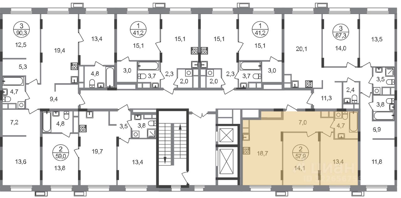 Общая площадь квартиры - 57,9 кв. м, этаж 6 из 9.
