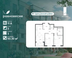 Продаётся квартира с 3 комнатами общей площадью 50.30 кв. метров на 3 этаже жилого квартала комфорт-класса "Равновесие".