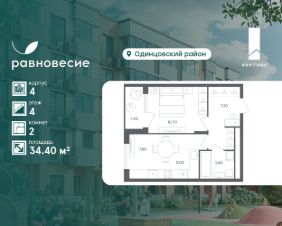 Продаётся квартира с 2 комнатами общей площадью 34.40 кв. метров на 4 этаже жилого квартала комфорт-класса "Равновесие".