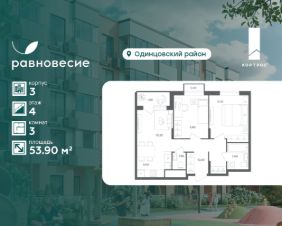 Продаётся квартира с 3 комнатами общей площадью 53.90 кв. метров на 4 этаже жилого квартала комфорт-класса "Равновесие".