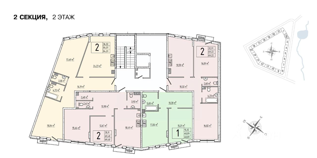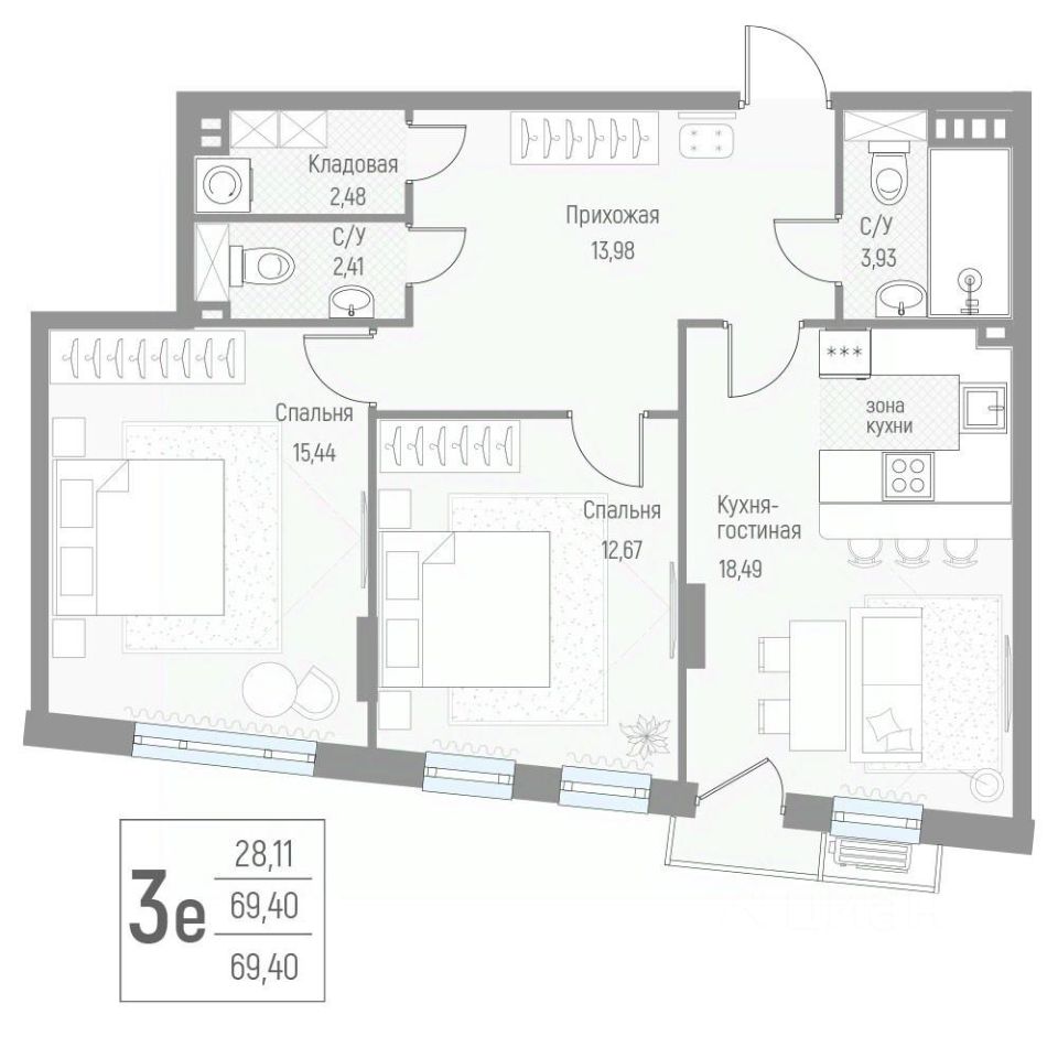 Продаётся евро 3-комнатная квартира общей площадью 69,2 м² на 2-м этаже 4-этажного дома.